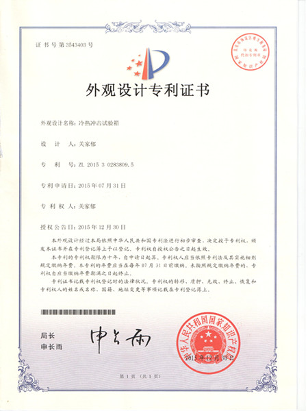 冷熱沖擊試驗(yàn)箱專利證書