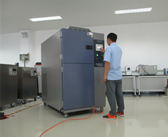 一:兩箱式的箱子工作原理是把塑料產品通過吊藍加氣體快速升降放入預先降溫的低溫箱或預先加熱的高溫箱,不停的循環或者交變,因此變溫速度快,沖擊效果好。